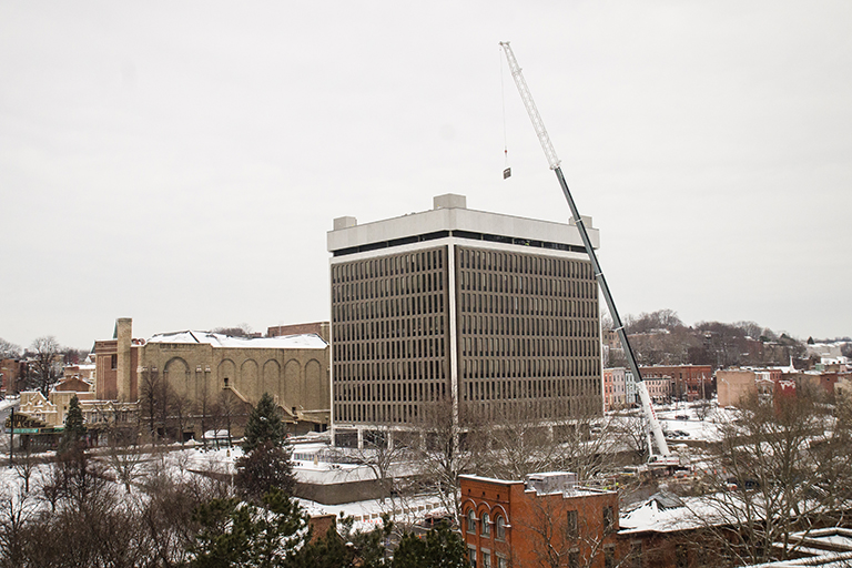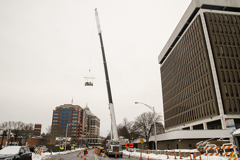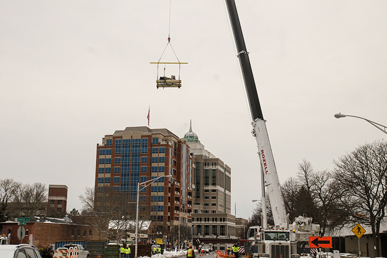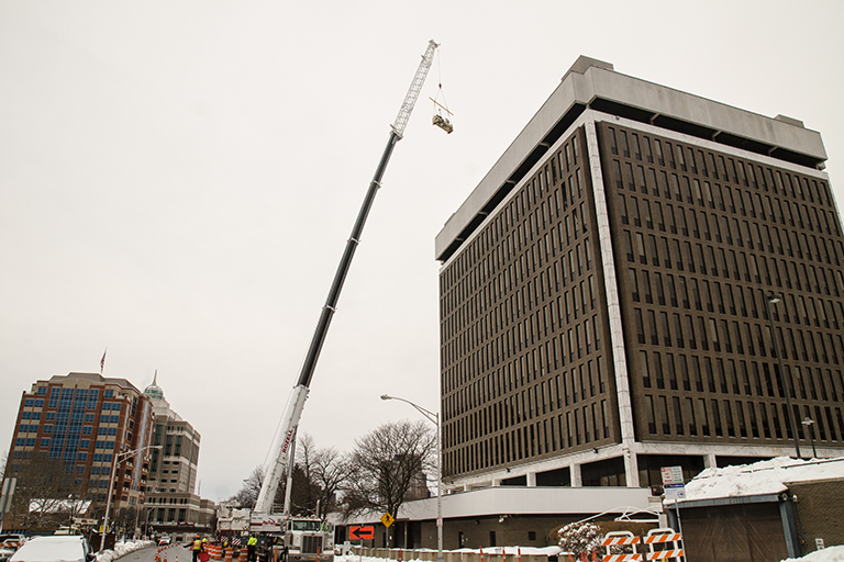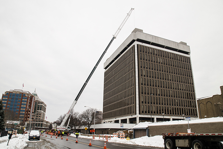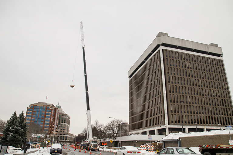 Rozell Industries was recently contracted to remove heavy equipment from the Federal Building in downtown Albany, NY. Using our 450 Ton Crane, the Tadano ATF 400G-6, crewed by our experienced team of fully certified professional equipment operators, we removed a host of oversized and heavy building equipment. Some of what we removed using our biggest and one the largest cranes for rent in the Capital District, includes a 2,493 lb. heat exchanger, a 10,170 lb. cooling tower and an almost 16,000 lb. (8 ton) chiller unit. For the best and most professional crane rental in Albany NY and throughout upstate, look no further than Rozell Industries. Contact us today for a quote!