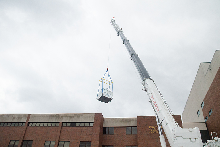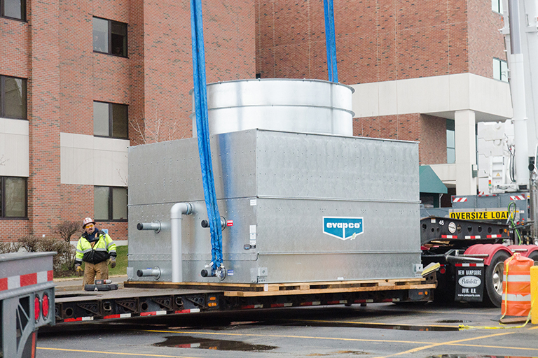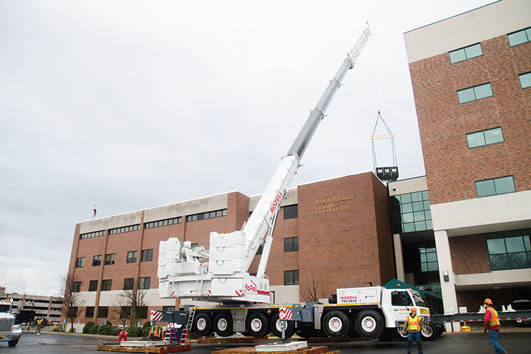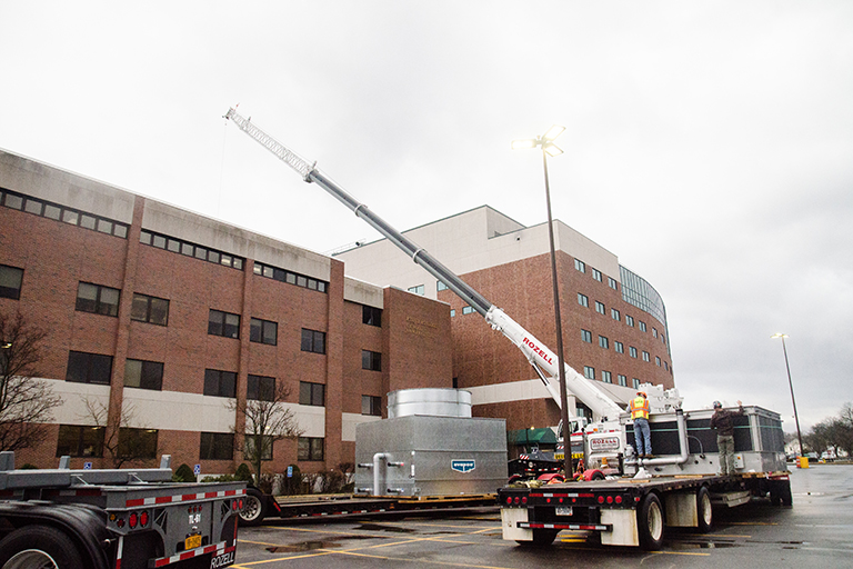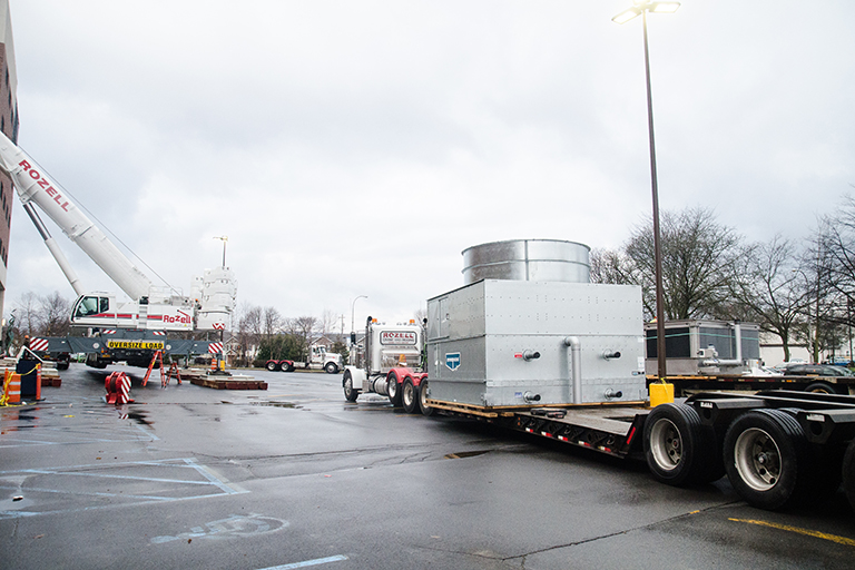 Rozell's heavy hauling team also delivered the parts to the hospital using flatbed trailers and hauled away the existing unit that was removed.