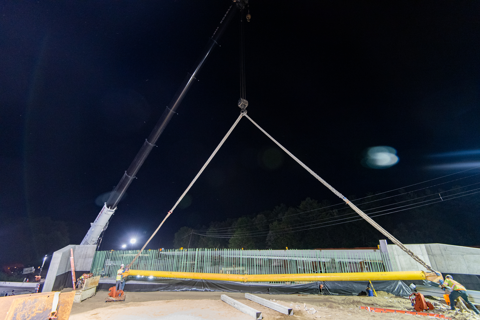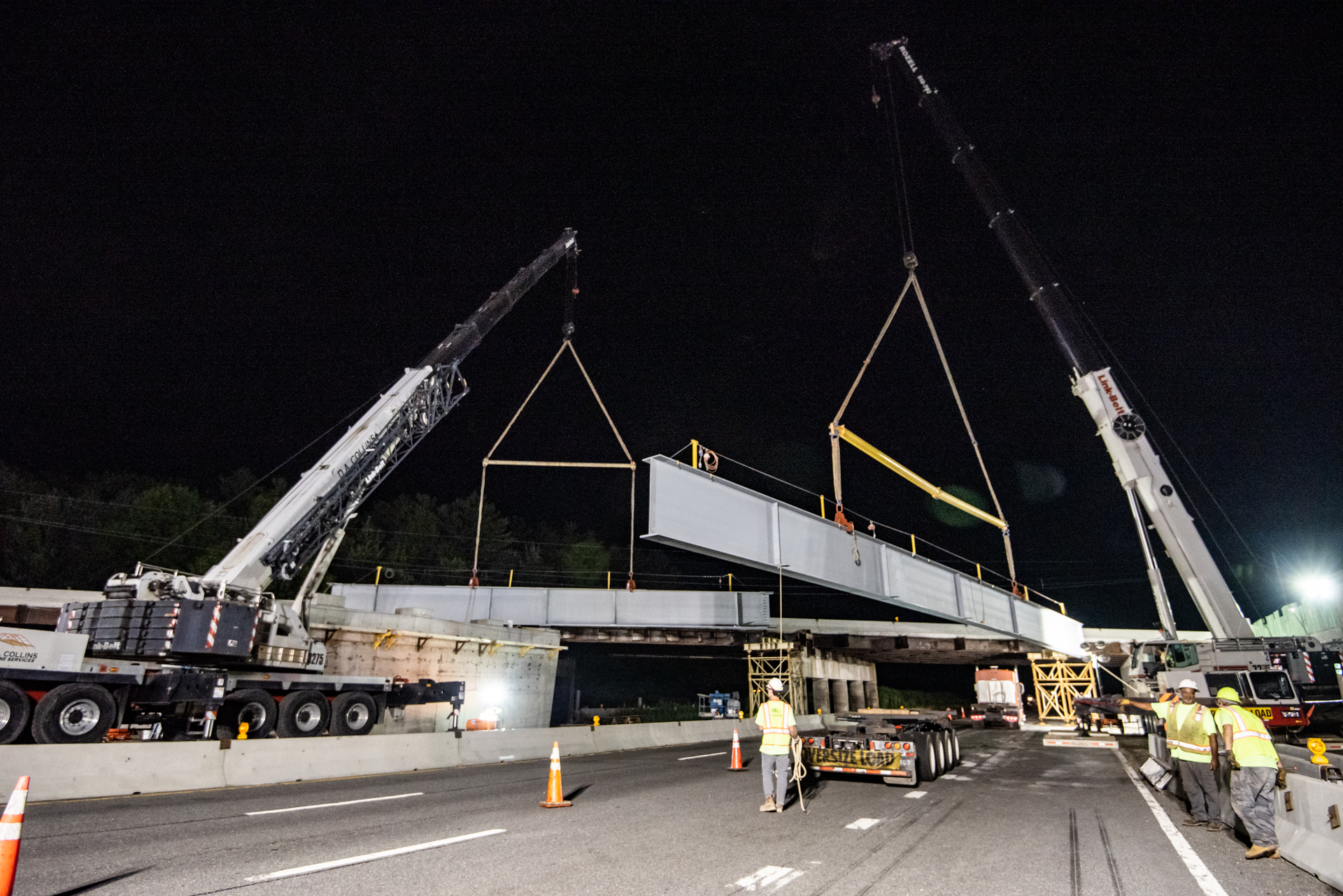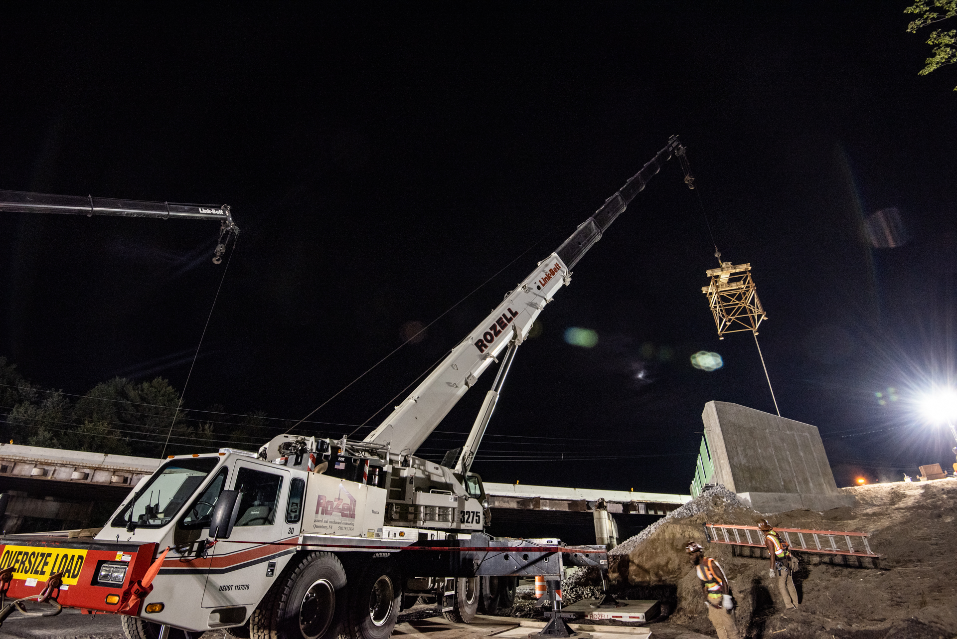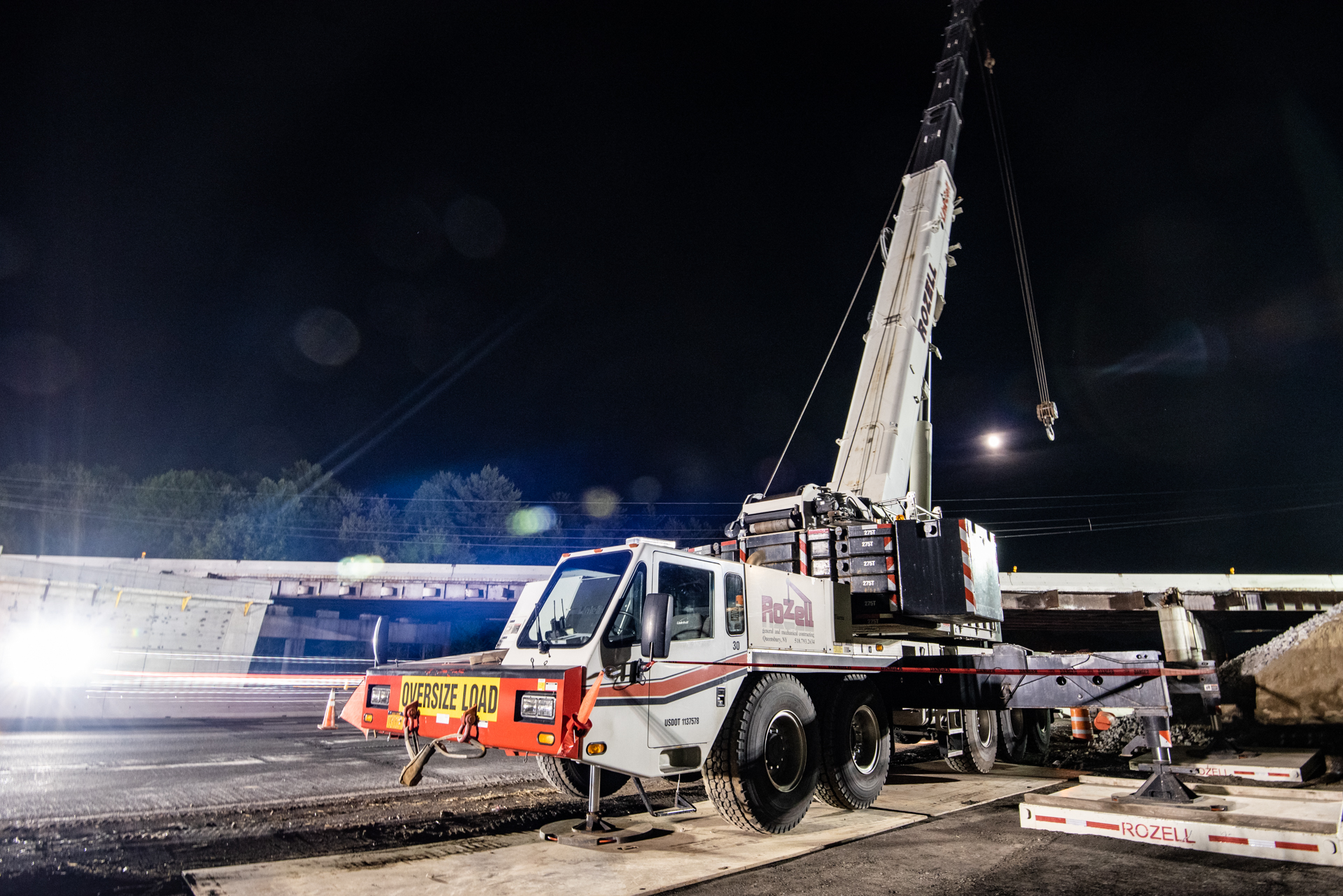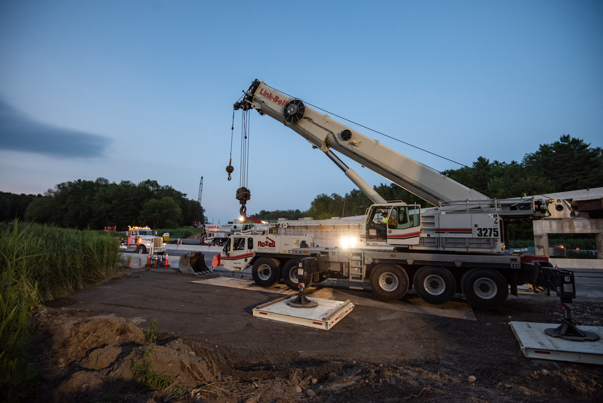 Rozell Industries helped D.A. Collins set beams for the new The Exit 17 bridge on the Adirondack Northway (I-87) in July 2022. Each beam that Rozell set was 134 feet long and weighed in at 75,000 lbs. Our 275 ton Link-Belt ATC3275 crane helped get the job done quickly and safely overnight while the highway was closed.