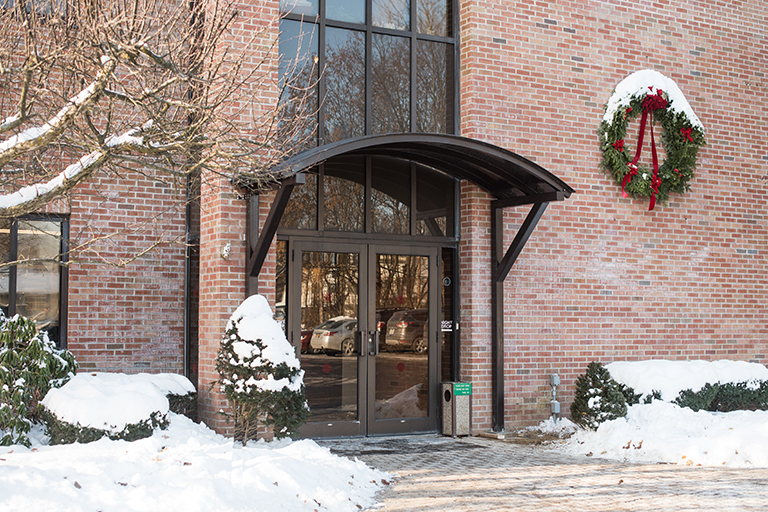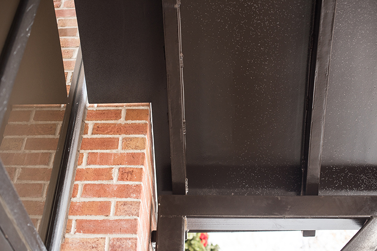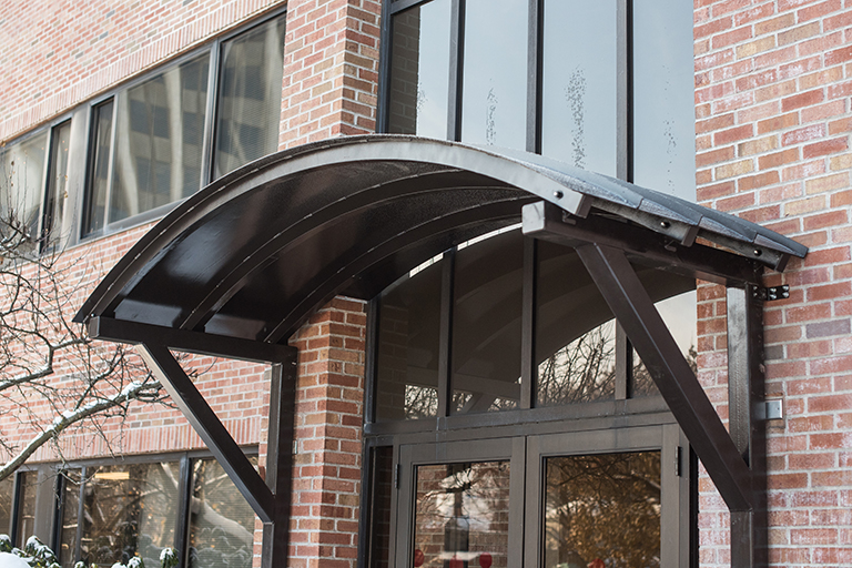 Our custom metal fabrication and professional design team created this beautiful custom metal awning for an entryway for a local law office. This entry canopy was made from 4” tube steel columns which held up 3/16” rolled plate with faux standing seam ribs and radiuses tube framing. The roof was custom fabricated to fit within the existing brick facade and window section so there is minimal gap between building and awning. To match the metal framing for the windows, it was painted a modern dark brown. The footing was installed on concrete support piers. For your next custom metal awning project, contact us for a quote below.